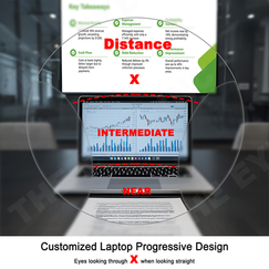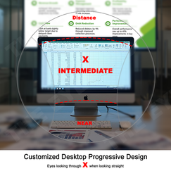 Customized Desktop Indoor progressive lenses provides superior intermediate viewing & reading zone while leaving you with the option to occasionally view distance through the top portion of the lenses.